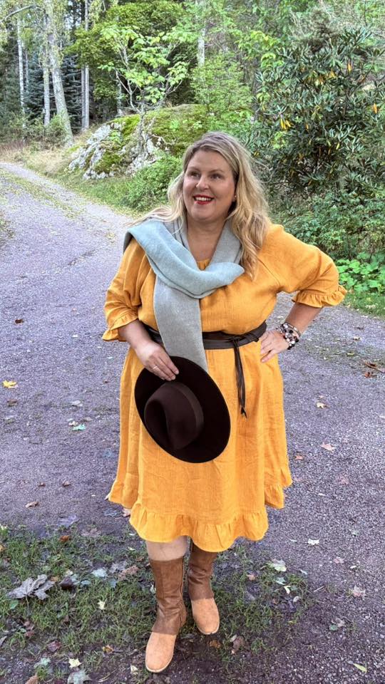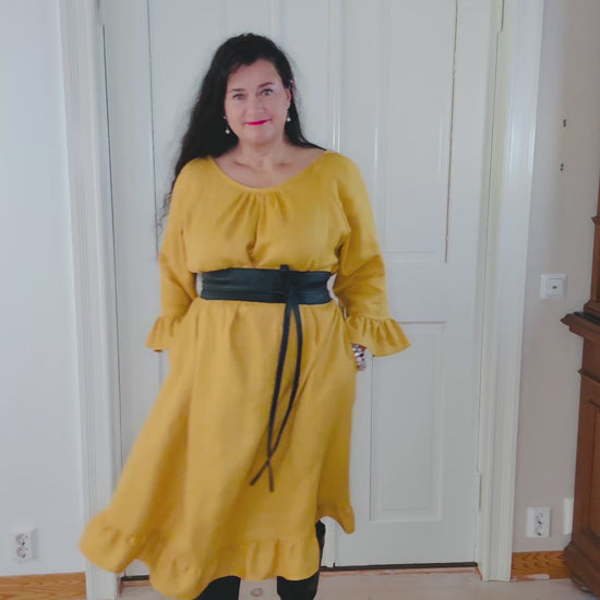 Marie on Cerubin rakastettu plus size ‑pellavamekko, jossa yhdistyvät arjen helppous ja harkittu juhlavuus. Mekossa on A-linjainen leikkaus, laskostettu pyöreä kaulus, sirot frillahihat ja reilun mittainen helma polven alapuolelle. Kauniit laskokset kauluksessa ja olkapäillä tuovat pehmeyttä ja rakennetta, ja sivutaskut tekevät mekosta myös käytännöllisen.