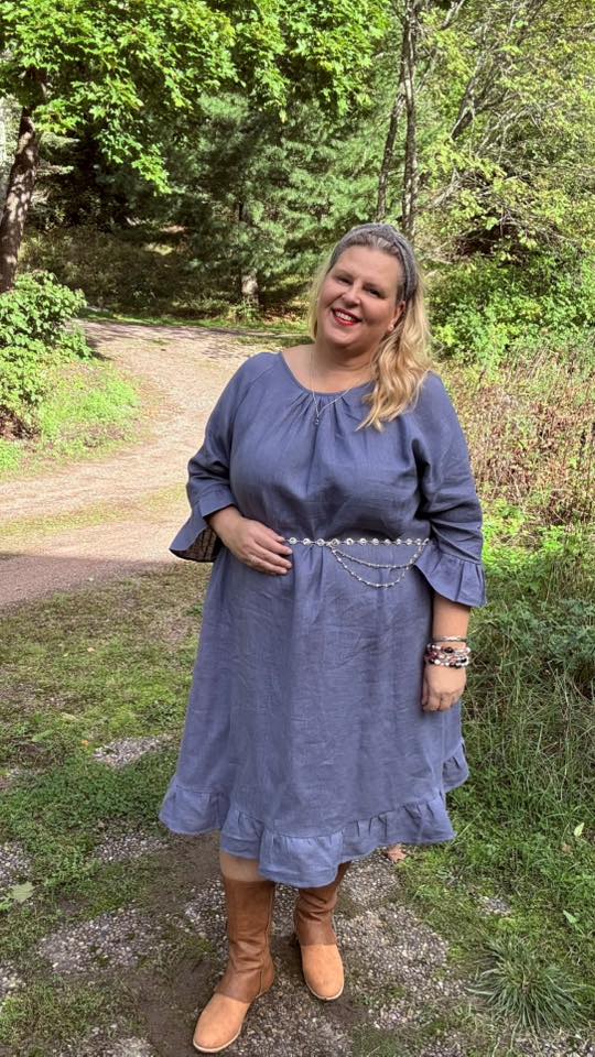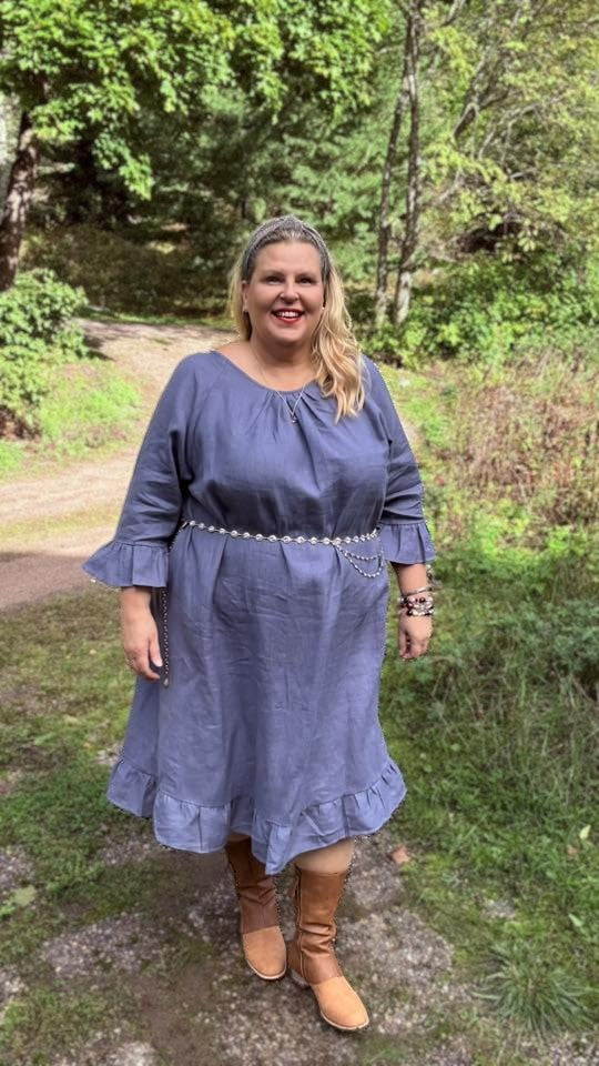 Marie on Cerubin rakastettu plus size ‑pellavamekko, jossa yhdistyvät arjen helppous ja harkittu juhlavuus. Mekossa on A-linjainen leikkaus, laskostettu pyöreä kaulus, sirot frillahihat ja reilun mittainen helma polven alapuolelle. Kauniit laskokset kauluksessa ja olkapäillä tuovat pehmeyttä ja rakennetta, ja sivutaskut tekevät mekosta myös käytännöllisen.