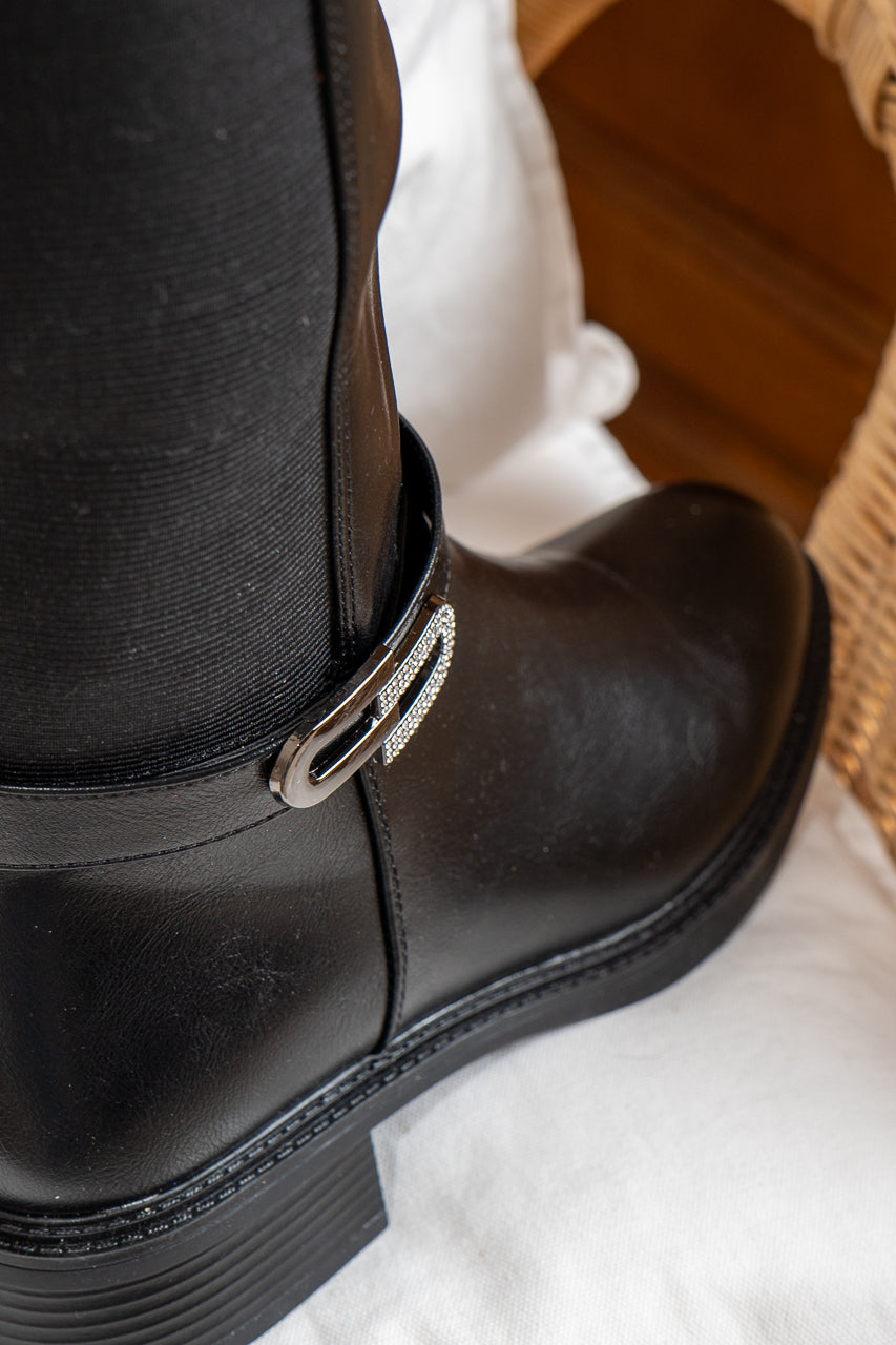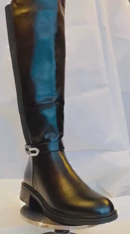 Saappaiden joustava osa varressa ja näyttävä strassisolki tuovat niihin sekä käytännöllisyyttä että näyttävyyttä. Vetoketju lisää mukavuutta pukemiseen ja riisumiseen, kun taas strassisolki antaa saappaille ripauksen luksusta ja silmiinpistävää tyyliä. Saappaissa on vuori.