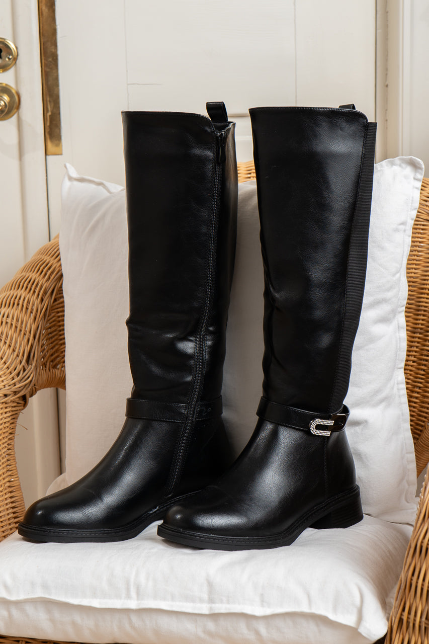 Saappaat, joissa joustava osa varressa ja näyttävä strassisolki